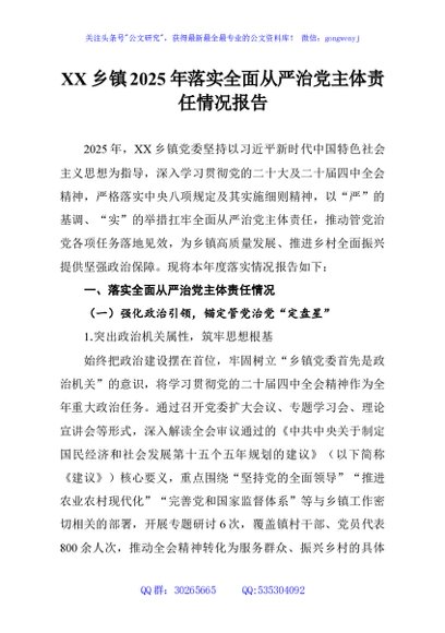 / XXX乡镇2025年落实全面从严治党主体责任情况报告