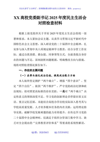 / XX高校党委副书记2025年度民主生活会对照检查材料