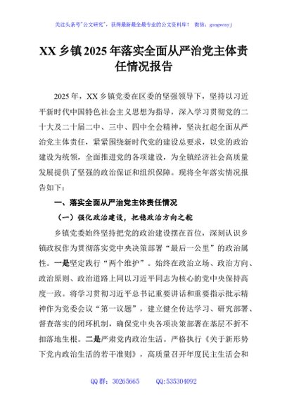 / XX乡镇2025年落实全面从严治党主体责任情况报告
