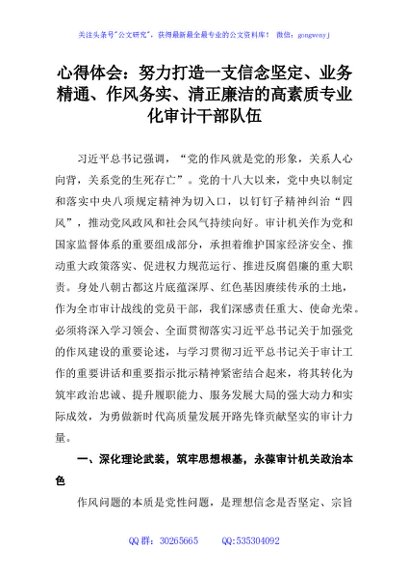 / 心得体会:努力打造一支信念坚定、业务精通、作风务实、清正廉洁的高素质专业化审计干部队伍