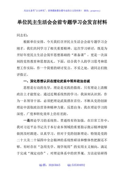 / 单位民主生活会会前专题学习会发言材料