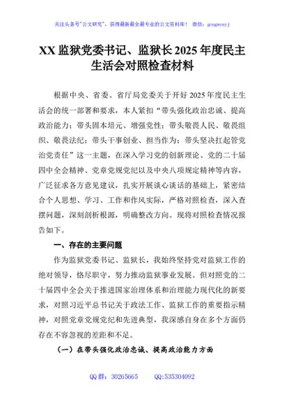 / XX监狱党委书记、监狱长2025年度民主生活会对照检查材料