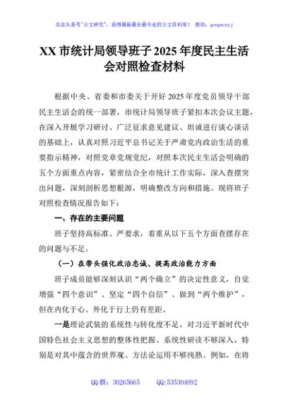 / XX市统计局领导班子2025年度民主生活会对照检查材料