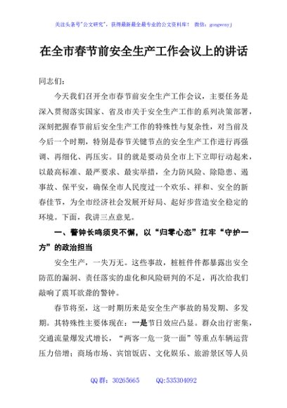 / 在全市春节前安全生产工作会议上的讲话
