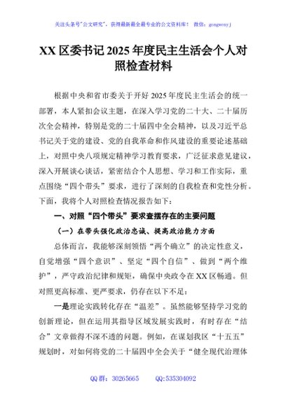 / XX区委书记2025年度民主生活会个人对照检查材料