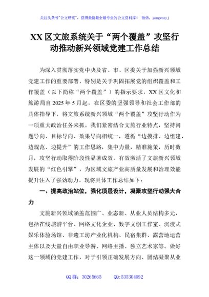 / XX区文旅系统关于“两个覆盖”攻坚行动推动新兴领域党建工作总结