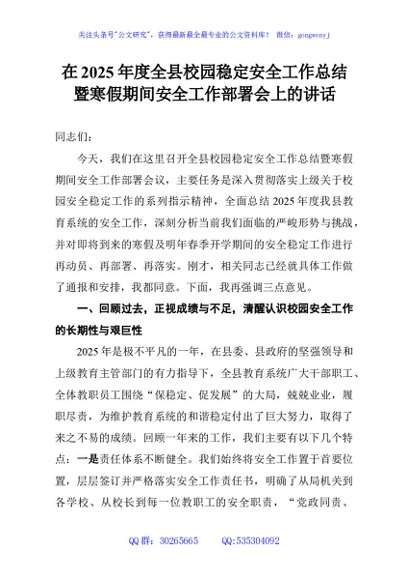 / 在2025年度全县校园稳定安全工作总结暨寒假期间安全工作部署会上的讲话