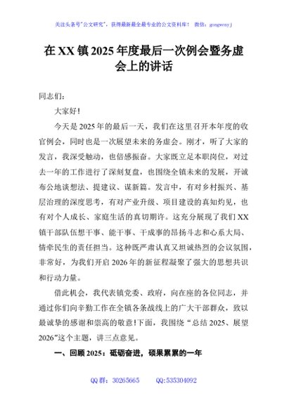 / 在XX镇2025年度最后一次例会暨务虚会上的讲话