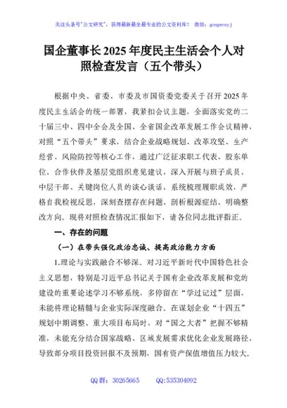 / 国企董事长2025年度民主生活会个人对照检查发言(五个带头)