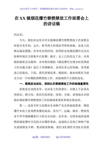 / 在XX镇烟花爆竹禁燃禁放工作部署会上的讲话稿