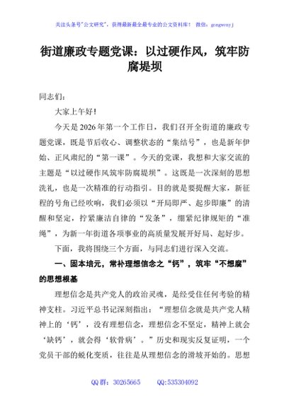 / 街道廉政专题党课:以过硬作风,筑牢防腐堤坝