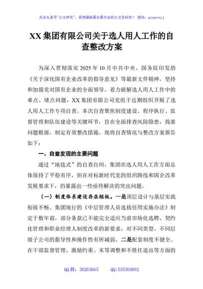/ XX集团有限公司关于选人用人工作的自查整改方案
