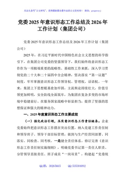 未生成预览图,长按二维码添加 党委2025年意识形态工作总结及2026年工作计划(集团公司) - 公文研究