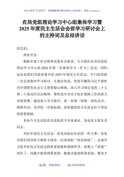 / 在局党组理论学习中心组集体学习暨2025年度民主生活会会前学习研讨会上的主持词及总结讲话