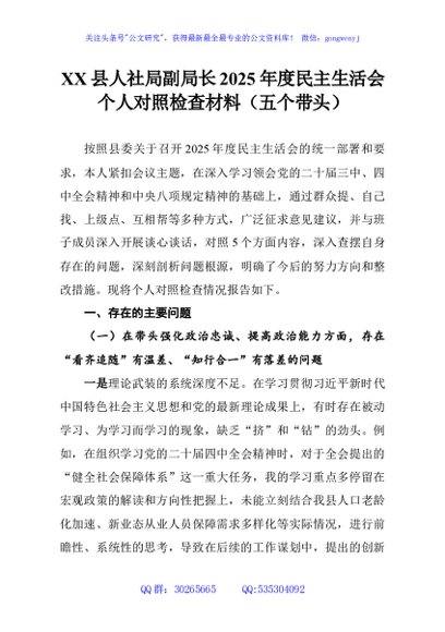 / XX县人社局副局长2025年度民主生活会个人对照检查材料(五个带头)