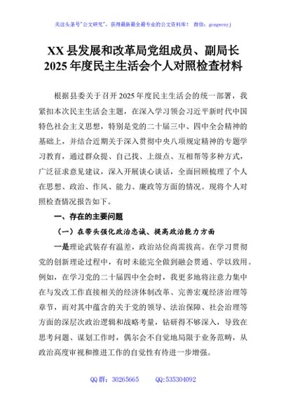 / XX县发展和改革局党组成员、副局长2025年度民主生活会个人对照检查材料