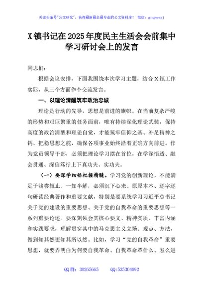 / X镇书记在2025年度民主生活会会前集中学习研讨会上的发言