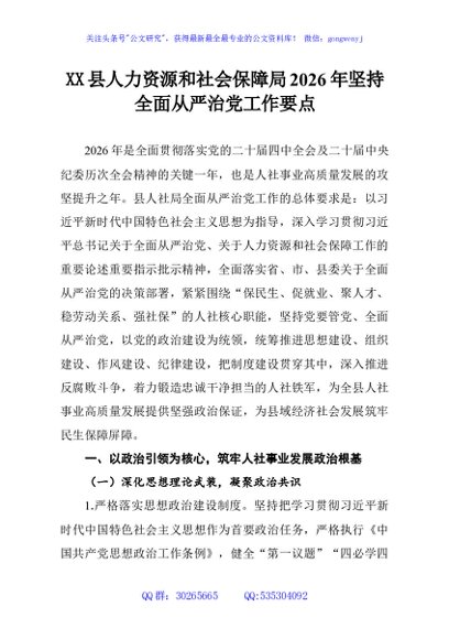 / XX县人力资源和社会保障局2026年坚持全面从严治党工作要点