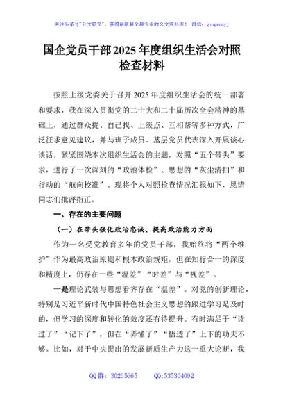 / 国企党员干部2025年度组织生活会对照检查材料