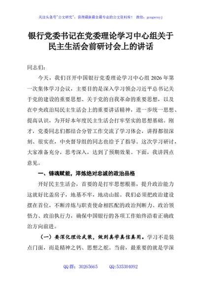 / 银行党委书记在党委理论学习中心组关于民主生活会前研讨会上的讲话