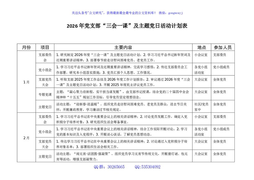 / 2026年党支部“三会一课”及主题党日活动计划表