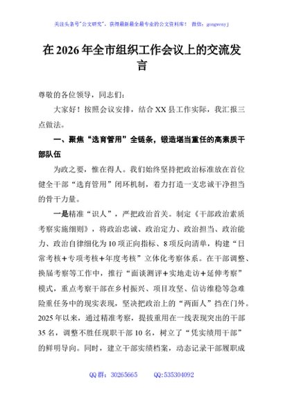 / 在2026年全市组织工作会议上的交流发言