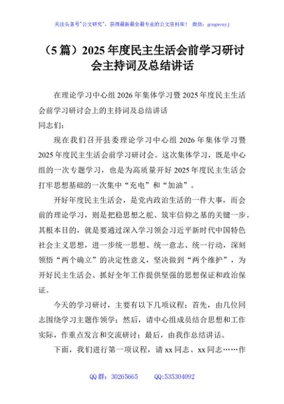 / (5篇)2025年度民主生活会前学习研讨会主持词及总结讲话