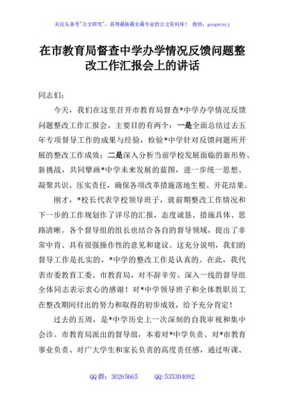 / 在市教育局督查中学办学情况反馈问题整改工作汇报会上的讲话