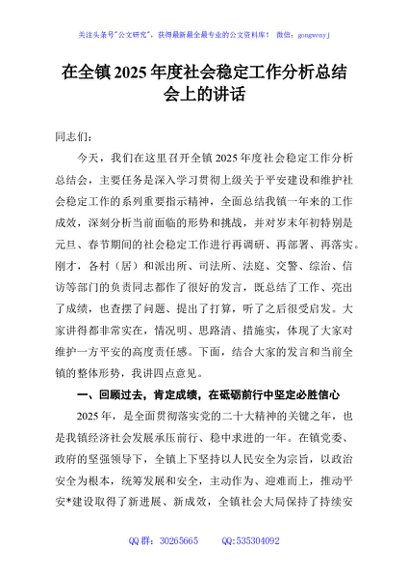 / 在全镇2025年度社会稳定工作分析总结会上的讲话
