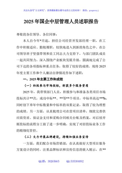 / 2025年国企中层管理人员述职报告