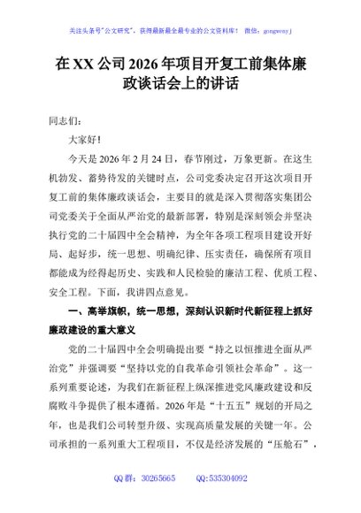 / 在XX公司2026年项目开复工前集体廉政谈话会上的讲话