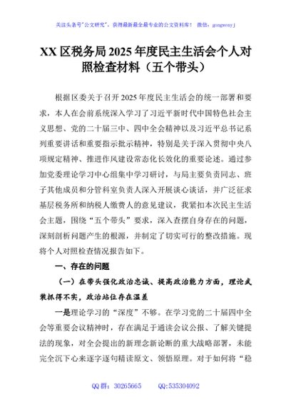 / XX区税务局2025年度民主生活会个人对照检查材料(五个带头)
