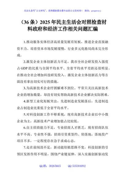 未生成预览图,长按二维码添加 (36条)2025年民主生活会对照检查材料政府和经济工作相关问题汇编 - 公文研究