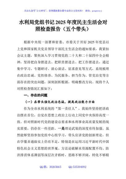 / 水利局党组书记2025年度民主生活会对照检查报告(五个带头)
