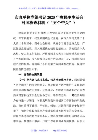 / 市直单位党组书记2025年度民主生活会对照检查材料(“五个带头”)