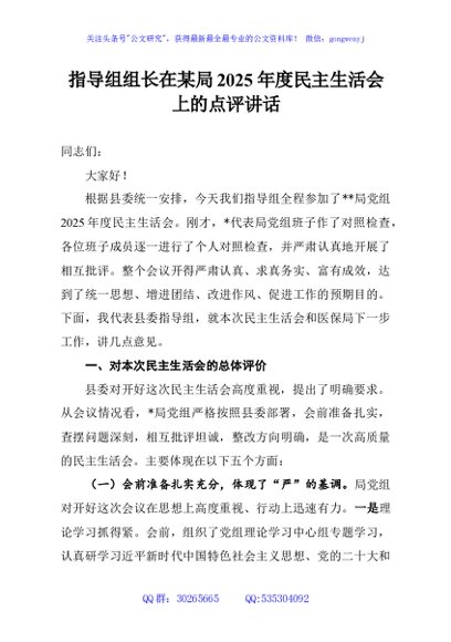 未生成预览图,长按二维码添加 指导组组长在某局2025年度民主生活会上的点评讲话 - 公文研究
