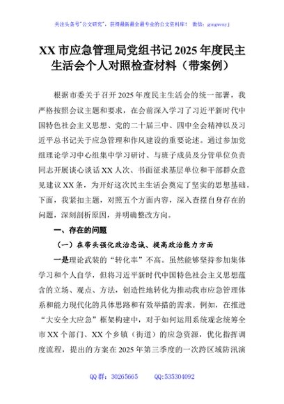 / XX市应急管理局党组书记2025年度民主生活会个人对照检查材料(带案例)