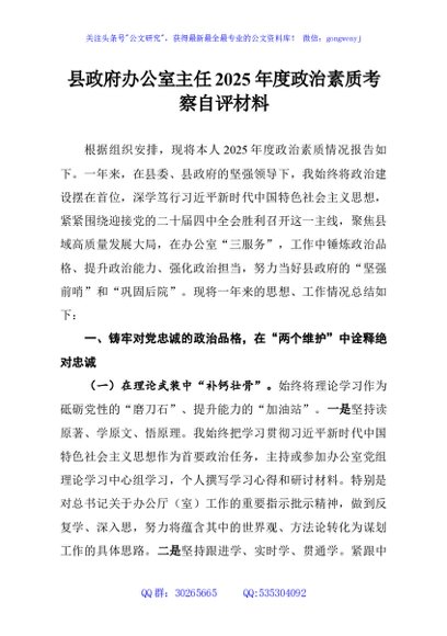/ 县政府办公室主任2025年度政治素质考察自评材料