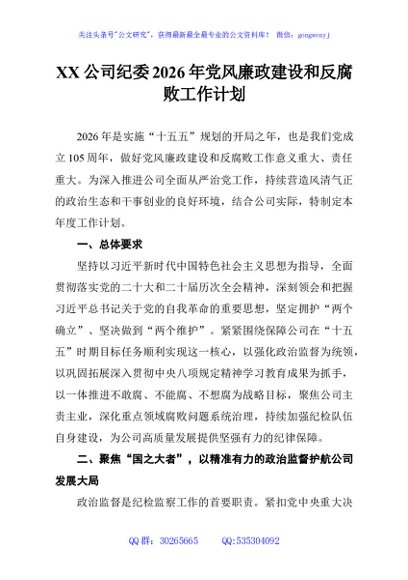 / XX公司纪委2026年党风廉政建设和反腐败工作计划
