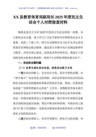 / XX县教育体育局副局长2025年度民主生活会个人对照检查材料