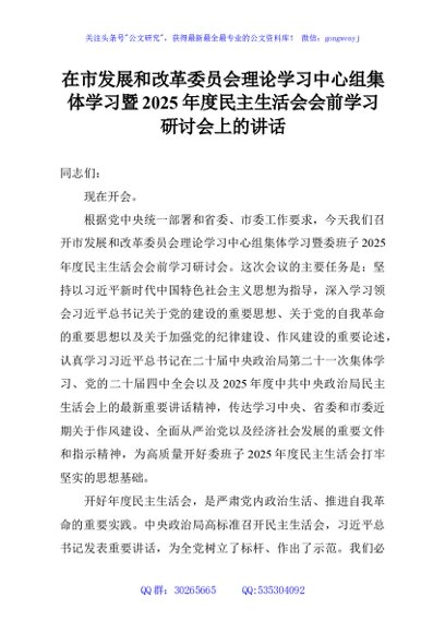 在市发展和改革委员会理论学习中心组集体学习暨2025年度民主生活会会前学习研讨会上的讲话 - 公文研究