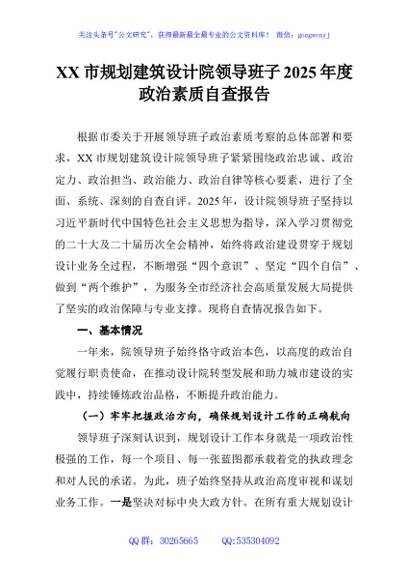/ XX市规划建筑设计院领导班子2025年度政治素质自查报告