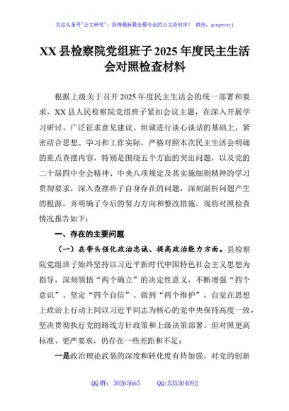/ XX县检察院党组班子2025年度民主生活会对照检查材料