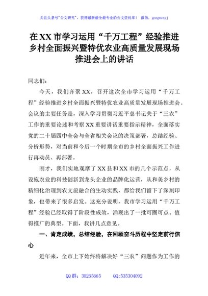 / 在XX市学习运用“千万工程”经验推进乡村全面振兴暨特优农业高质量发展现场推进会上的讲话