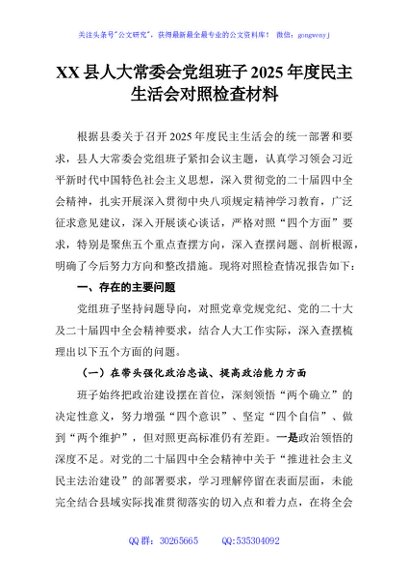 / XX县人大常委会党组班子2025年度民主生活会对照检查材料