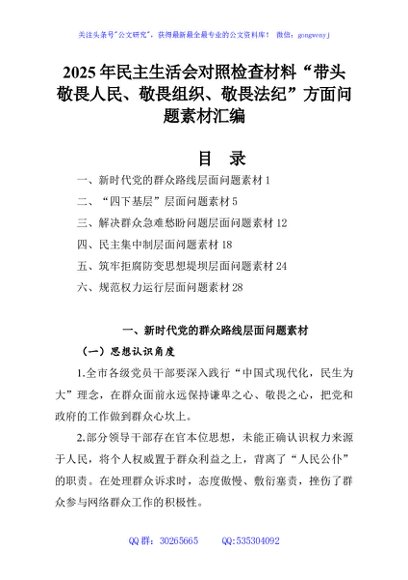 / 2025年民主生活会对照检查材料“带头敬畏人民、敬畏组织、敬畏法纪”方面问题素材汇编