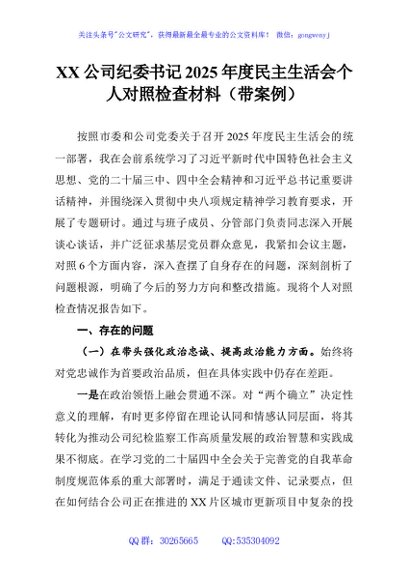 / XX公司纪委书记2025年度民主生活会个人对照检查材料(带案例)