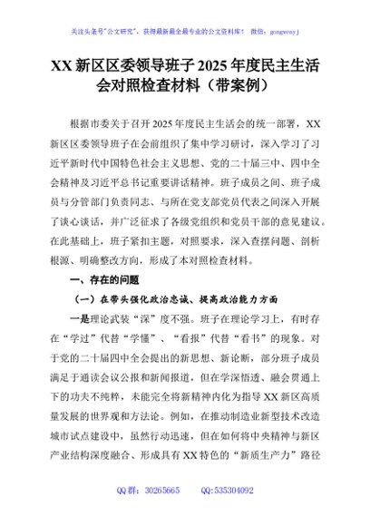 / XX新区区委领导班子2025年度民主生活会对照检查材料(带案例)