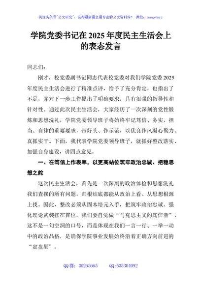 / 学院党委书记在2025年度民主生活会上的表态发言