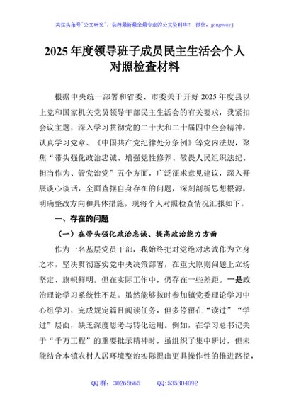 / 2025年度领导班子成员民主生活会个人对照检查材料